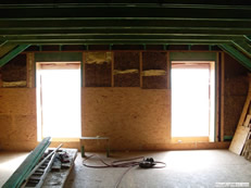 Postavíme rámovou konstrukci domu, která se vyplní izolací z balíků slámy. Z venkovní strany dáváme ve většině případů modřínový obklad, z vnitřní strany je rámová konstrukce oplášťována OSB deskami. Následně se provede test vzduchotěsnosti domu. Elektro a vodovodní rozvody jsou vedeny v montážní mezeře. Na již provedený rošt se montují sádrokartonové nebo sádrovláknité desky.